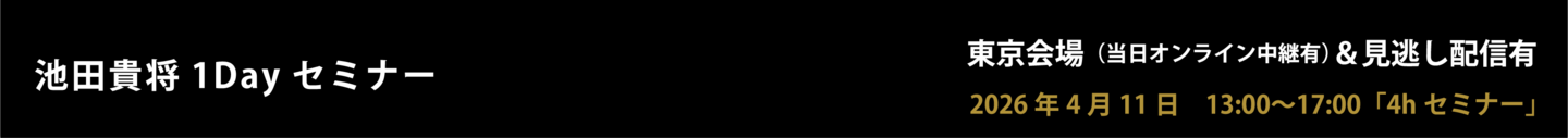 | 特 典 | \参加者限定・豪華無料プレゼント!/ 『池田貴将AI(The Switch AI)』を7日間、無料解放! 『The Swich』セミナー全コンテンツに加え、時間の都合で収まりきらなかった未公開研究も含め、その全てを学習した『池田貴将AI(The Switch AI)』を、参加者全員に無料開放いたします。 セミナーの復習はもちろん、「自分に置き換えるならどうしたら良いか?」まで、池田貴将に直接相談するかのごとくご相談いただけます。 録画配信開始と同時に7日間限定、完全無料でご利用いただけますのでどうぞお楽しみに! ※録画配信は、4月15日(水)開始予定 |