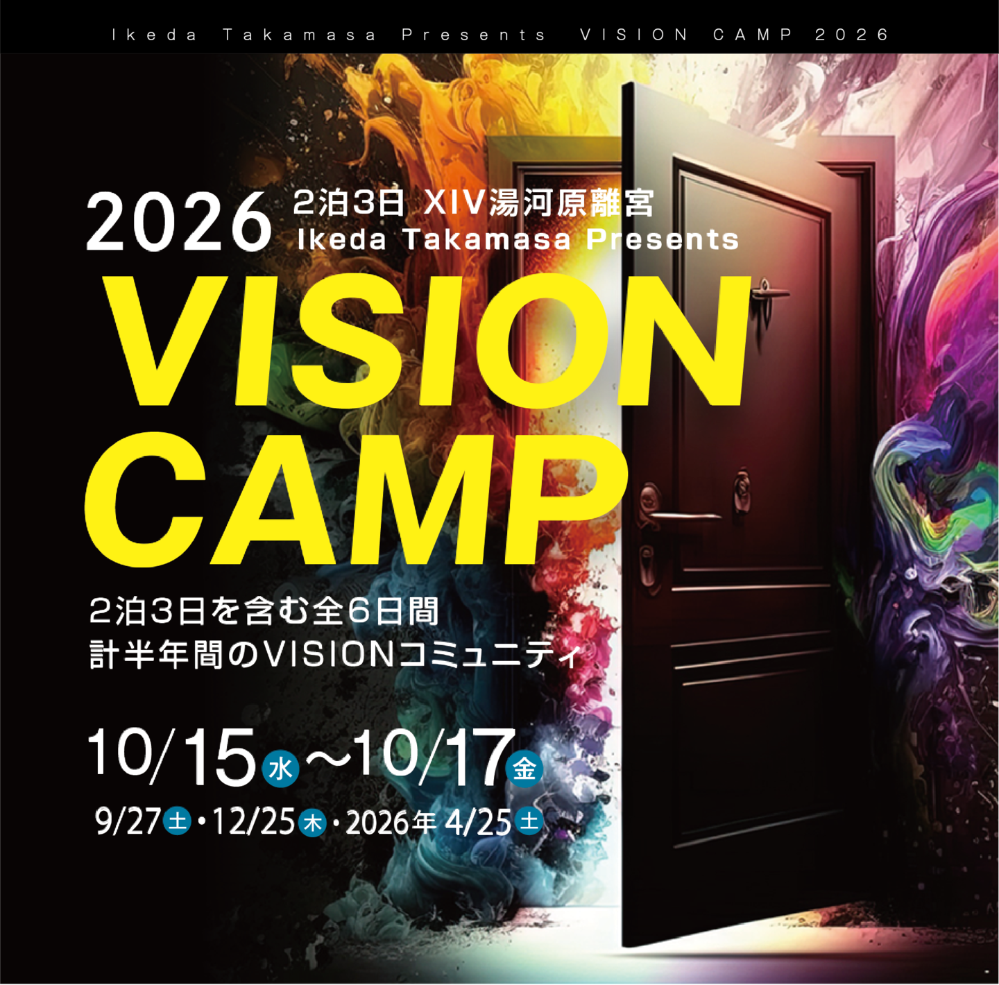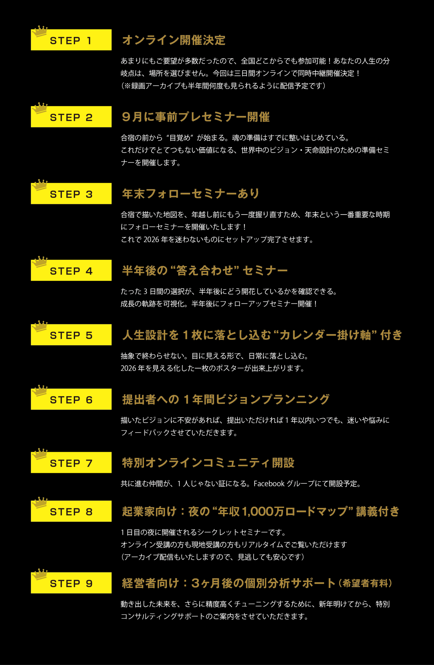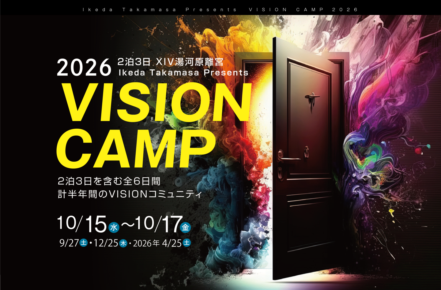 Q. 2026年4月にある、ビジョン設定合宿フォローセミナーは別料金でしょうか? A. こちらは全6日程のプログラムですので4月も無料でご参加いただけます。 (「Vision設定合宿2026」にお申込みでない方はご参加いただけませんので、予めご了承ください) |